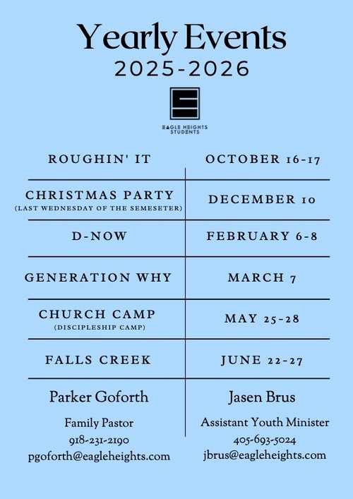 The Eagle Heights Student Ministry exists to glorify God in discipling young believers by teaching the Word of God, providing opportunities for Christian fellowship, and encouraging students to proclaim the Gospel of Jesus.